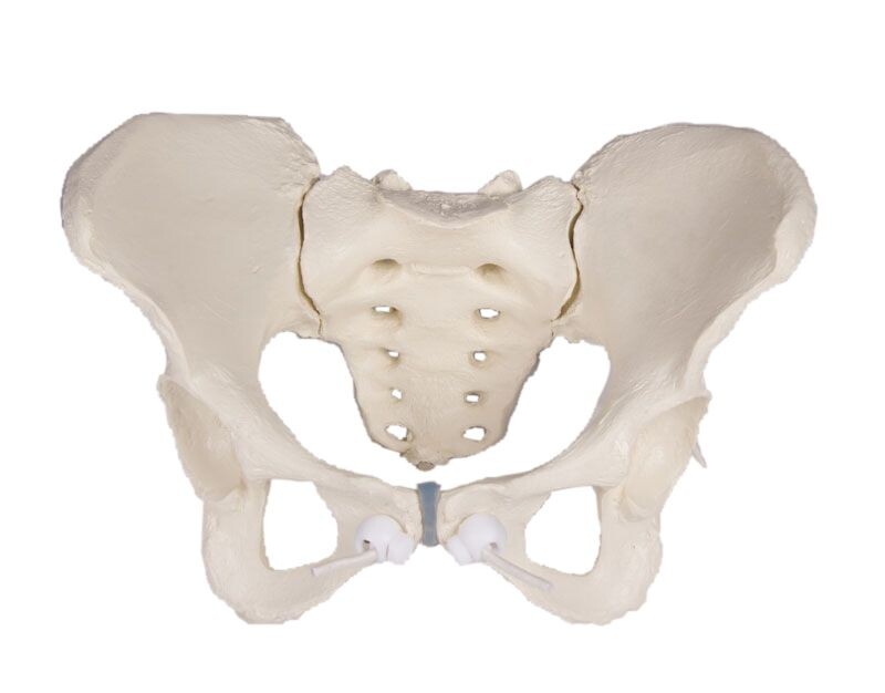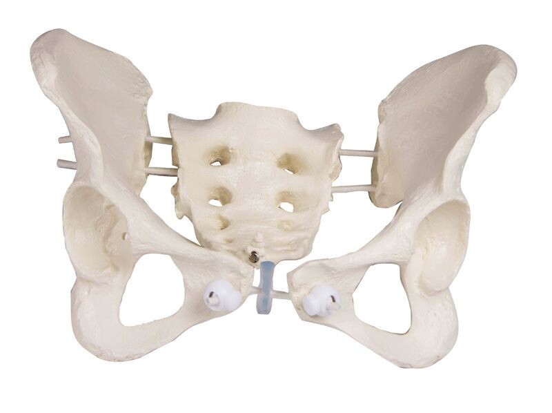 Naturtrogen avgjutning av ett vuxet kvinnligt bäcken, monterat på hållbart gummi för maximal rörlighet. Modellen är helt flexibel och möjliggör tydlig demonstration av bäckenets naturliga rörelser.